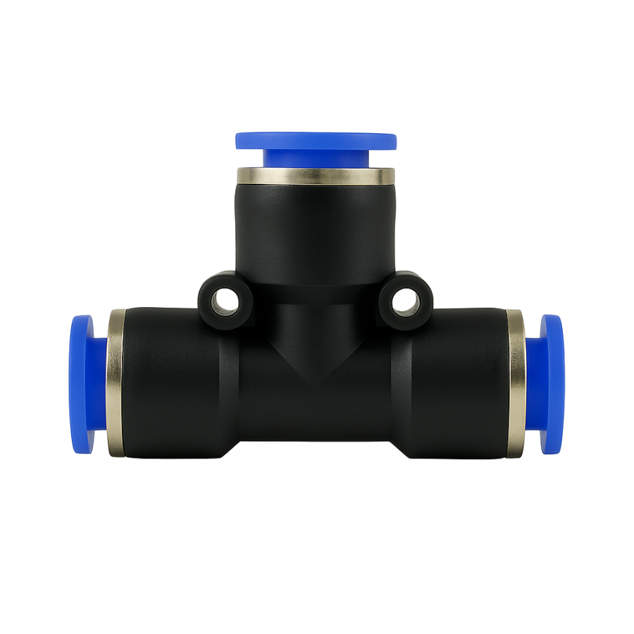 A Conexão União T Plástica é uma peça pneumática de engate rápido push-in, em formato de “T”, projetada para interligar três tubos com o mesmo diâmetro externo. Ela permite que o ar comprimido siga em linha reta e, ao mesmo tempo, seja derivado lateralmente — tudo com vedação precisa, instalação rápida e organização total do sistema.