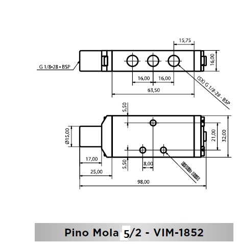 Tipo: Válvula pneumática 5/2 vias com pino de acionamento e mola de retorno